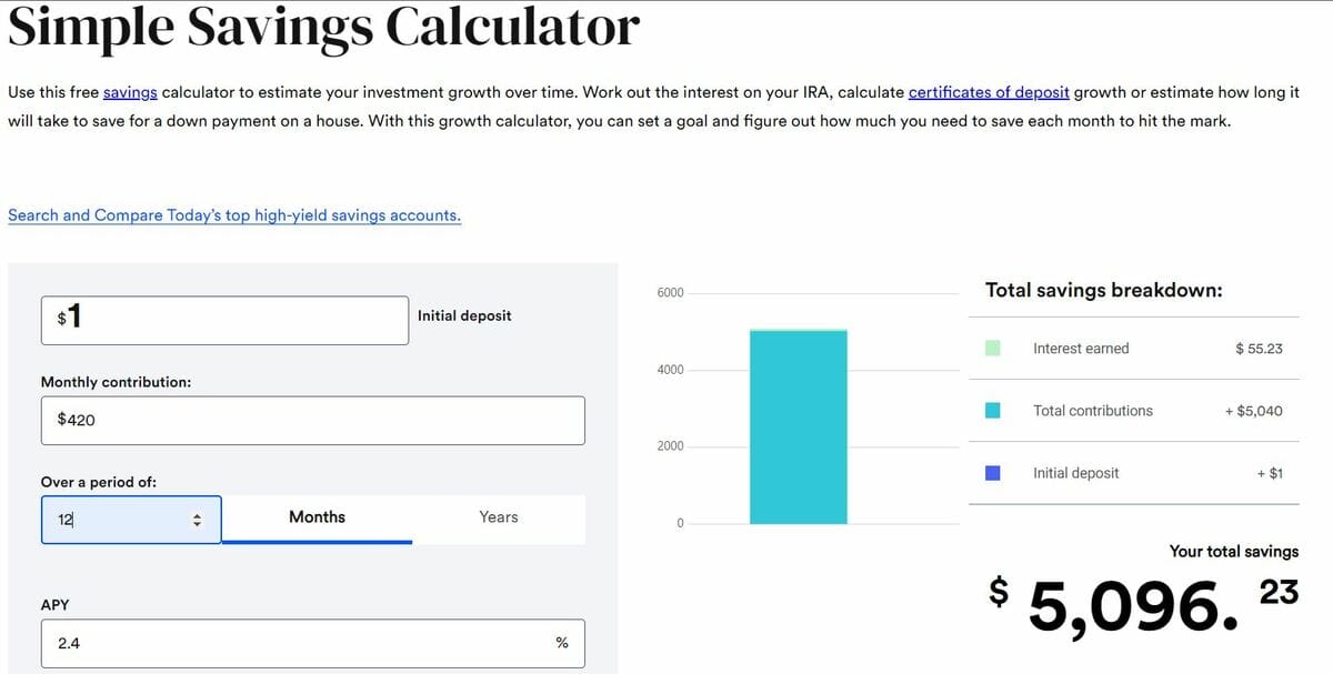 I plugged these numbers into a Savings Account calculator. If you saved $420 per month into a savings account offering a 2.4% interest rate, you would save $5,096.23 over 12 months.